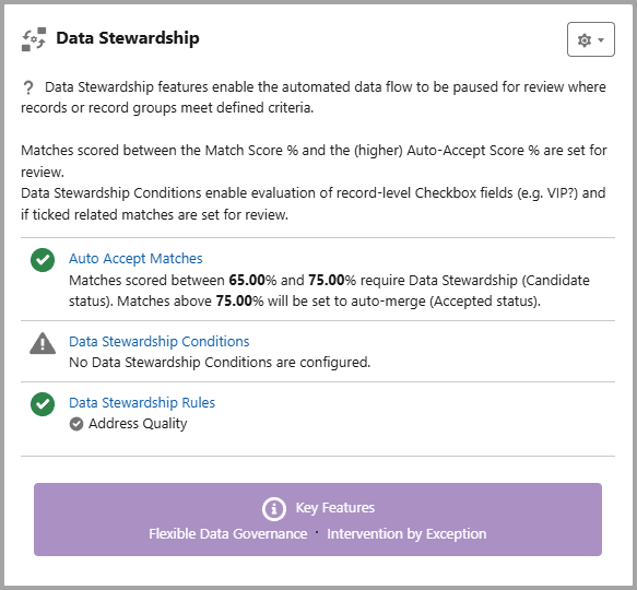 Data Stewardship features enable the automated data flow to be paused for review where records or record groups meet defined criteria. Matches scored between the Match Score % and the (higher) Auto-Accept Score % are set for review. Data Stewardship Conditions enable evaluation of record-level Checkbox fields (e.g. VIP?) and if ticked related matches are set for review.